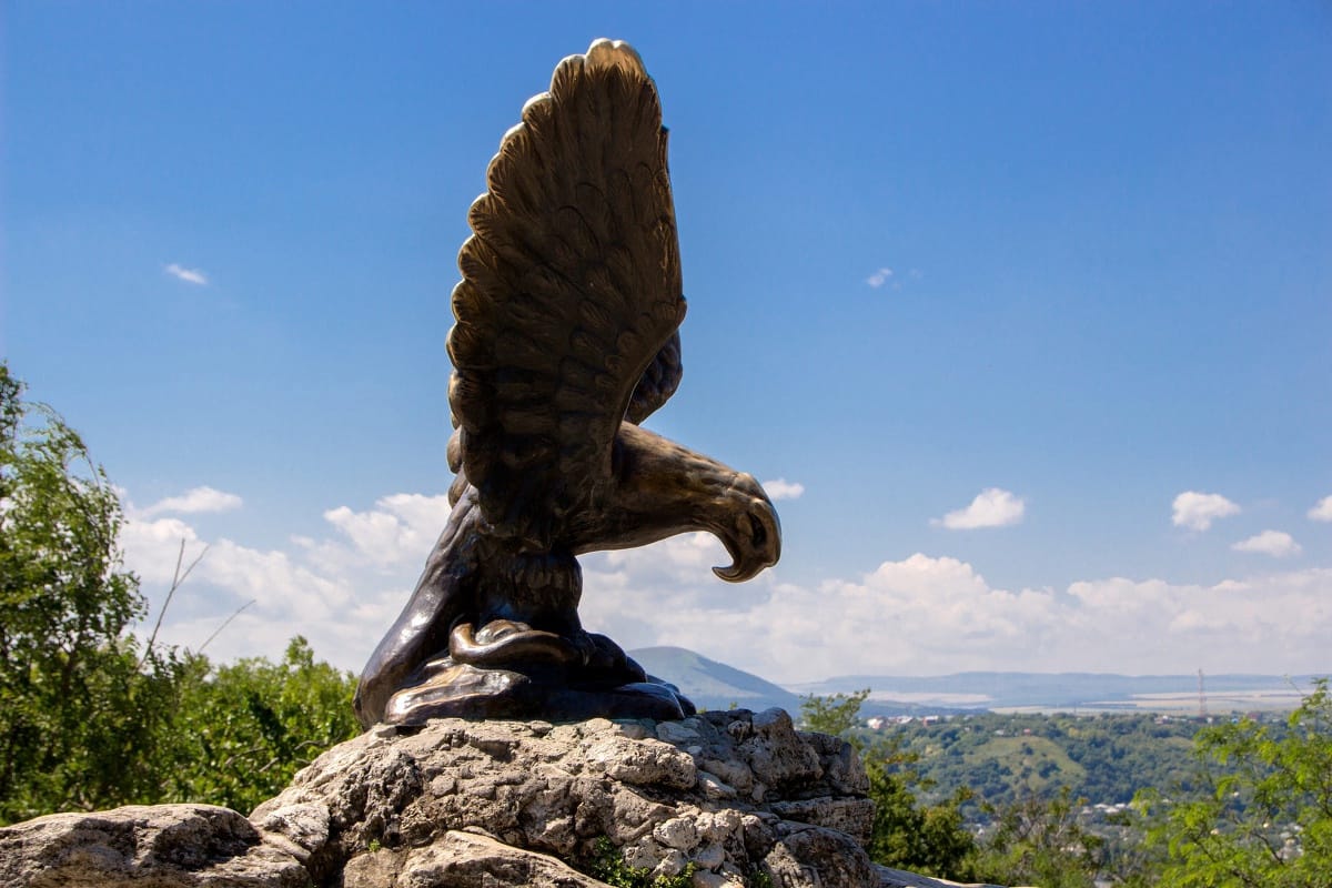 Также прогуляемся по горе Горячей до скульптуры Орла — символа Кавказских Минеральных Вод! Спустимся в старейший парк Пятигорска — «Цветник» мимо Грота Дианы, замечательного творения архитекторов братьев Бернардацци. Полюбовавшись прекрасной Лермонтовской галереей, опустим монетку в шляпу бронзового Кисы Воробьянинова…